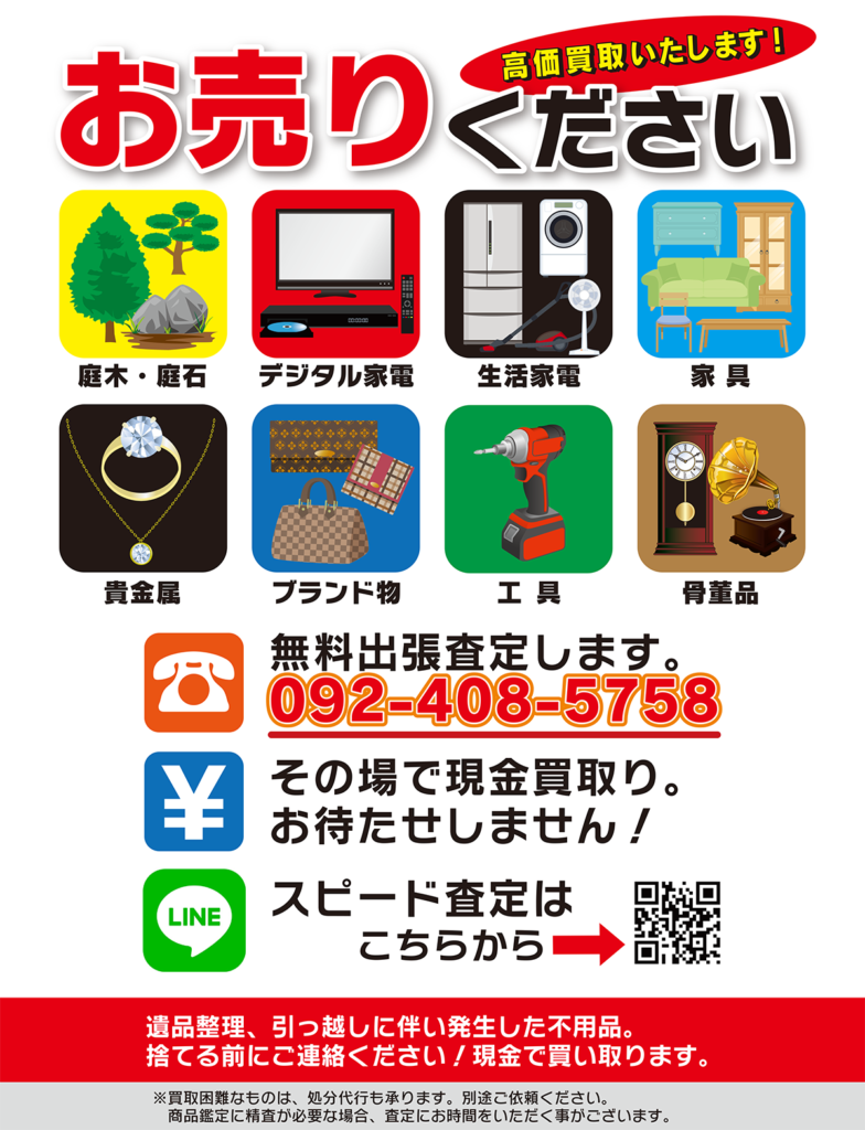 グリーンライフジャパンでは、「デジタル家電」「生活家電」「家具」「貴金属」「ブランドバッグ、財布等」「工具」「骨董品」の高価買取りも実施しています。お気軽にお問い合わせくださいませ。